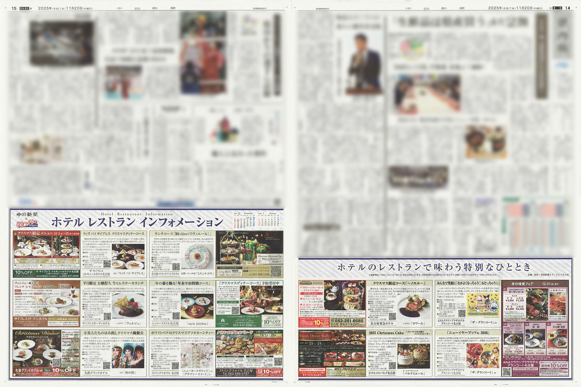名古屋市内の有名ホテルの秋のレストラン情報が掲載。12月のお食事に是非ご利用ください。
