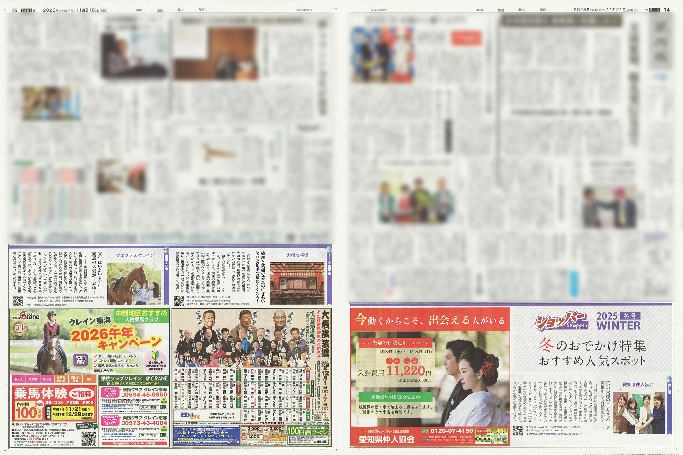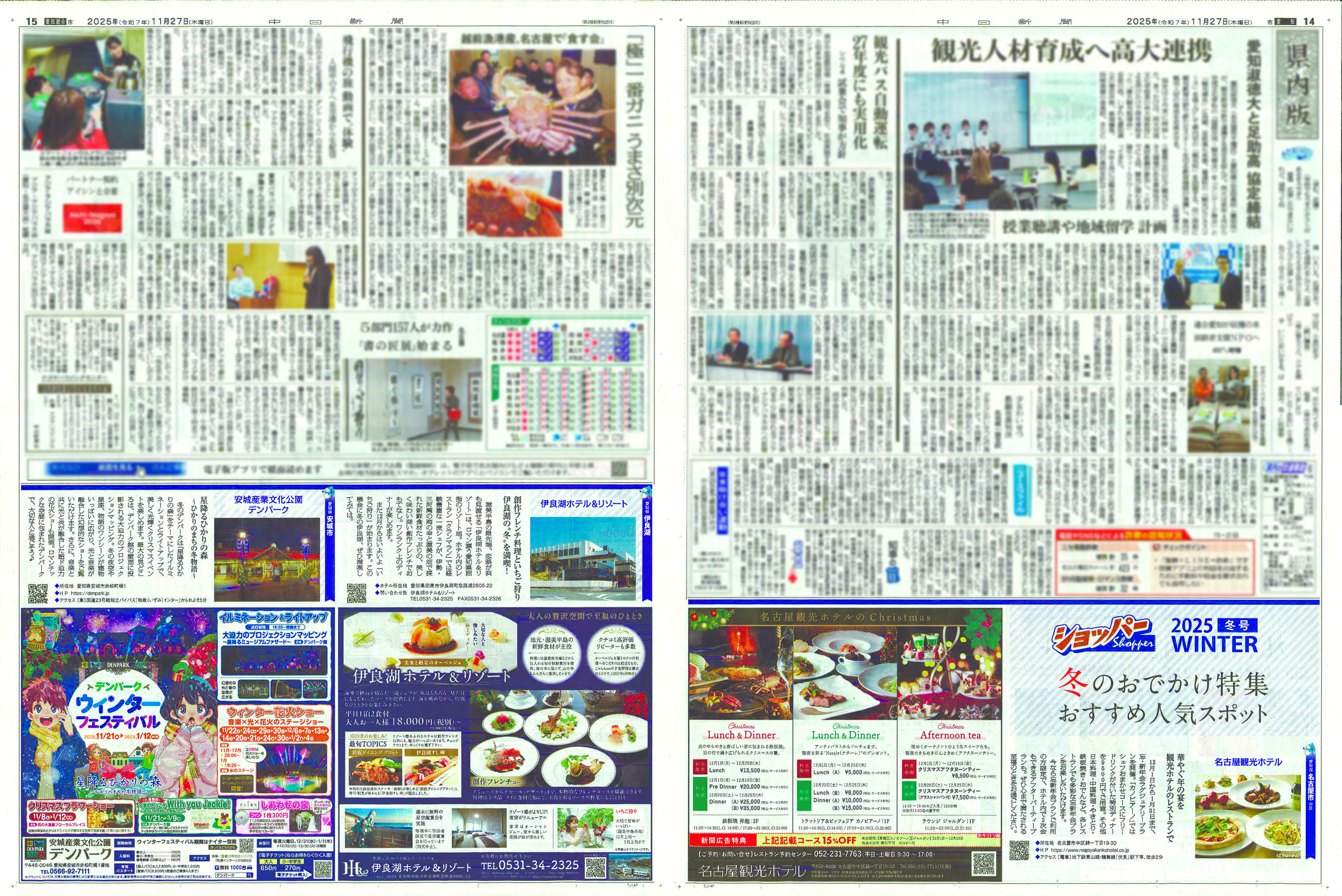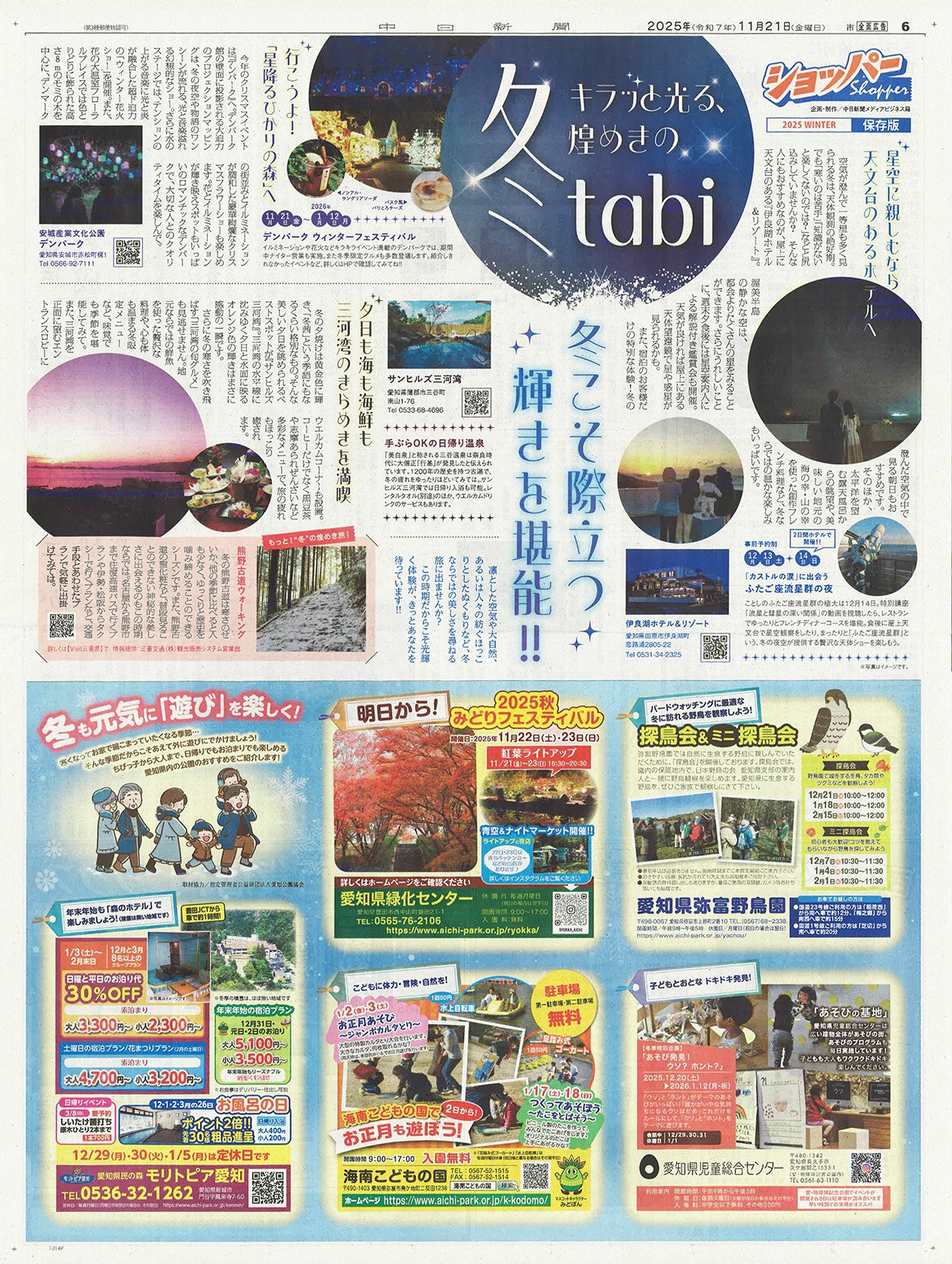 中日新聞市民版・尾張版にショッパー特別版(全15段、全5段+全7段)にて「キラッと光る、煌めきの冬tabi」「冬のおでかけ特集 おすすめ人気スポット」特集が掲載されました。