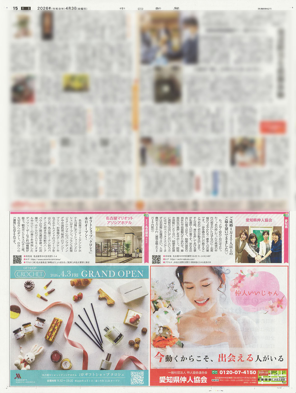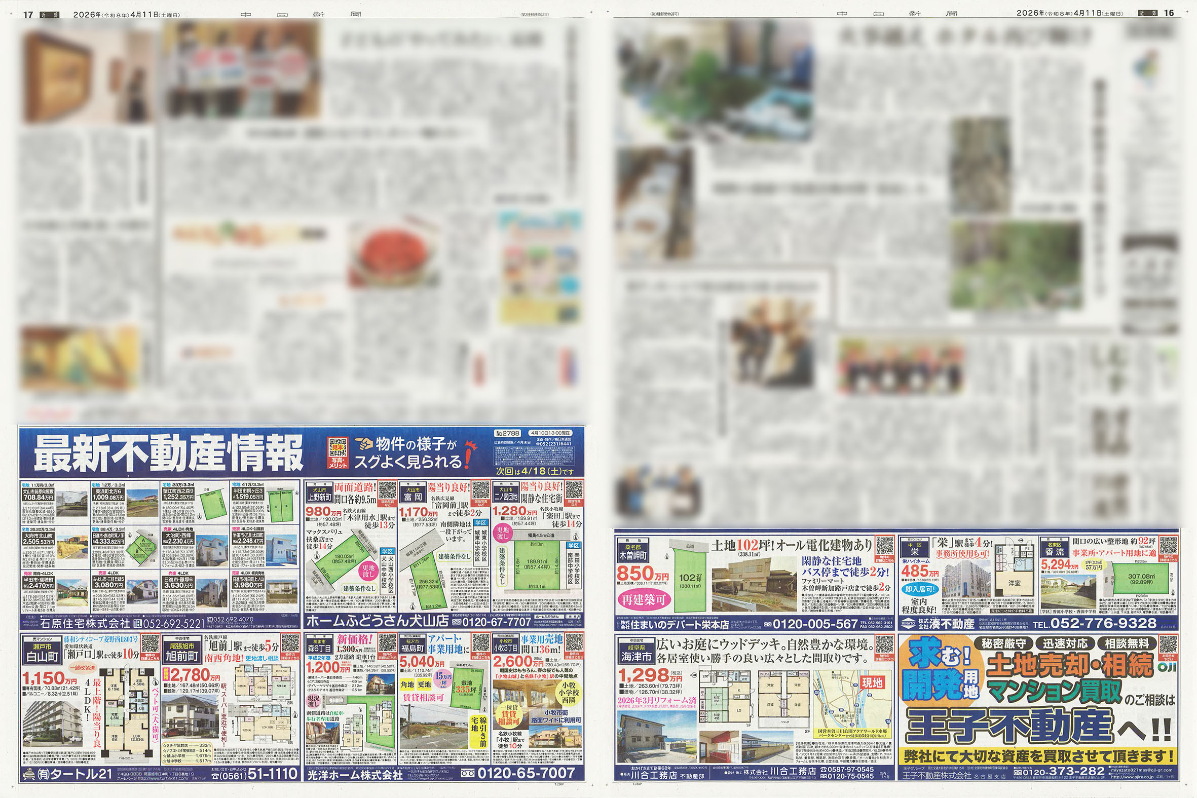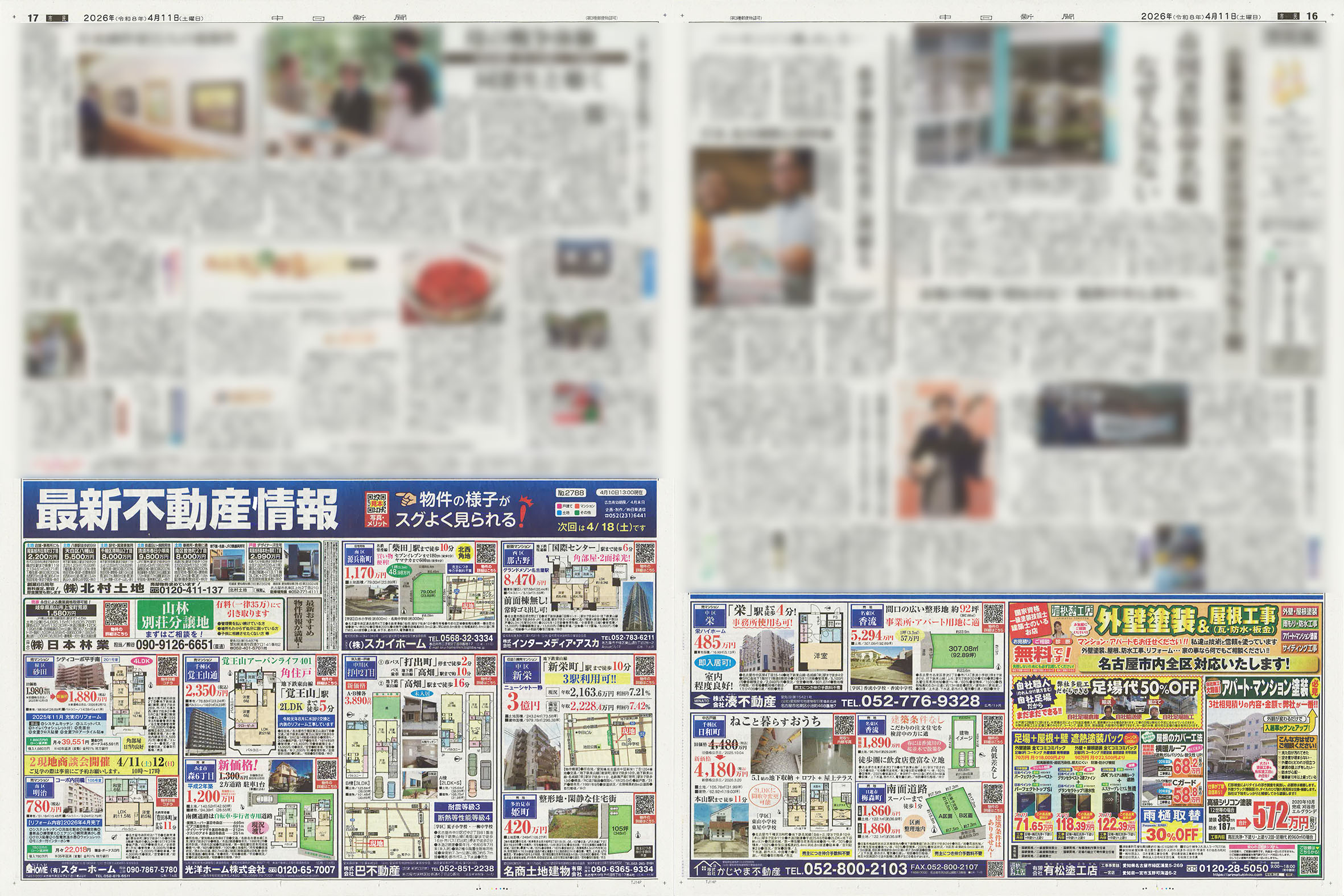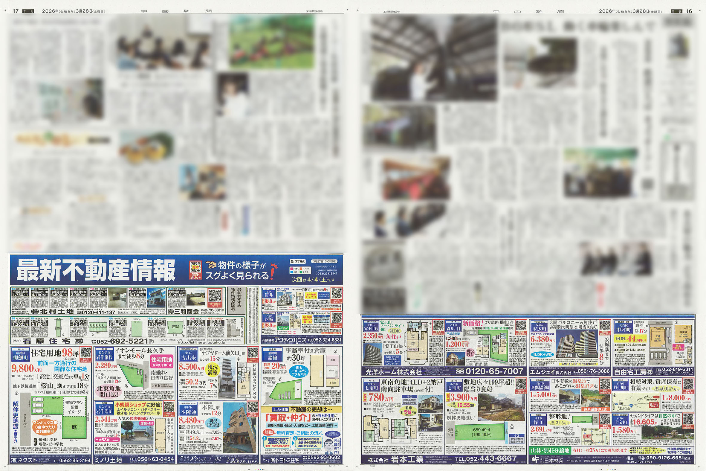 中日新聞市民版に最新不動産情報(全7段+全5段/カラー)、全尾張版に最新不動産情報(全7段+全5段/カラー)の掲載を予定しております。