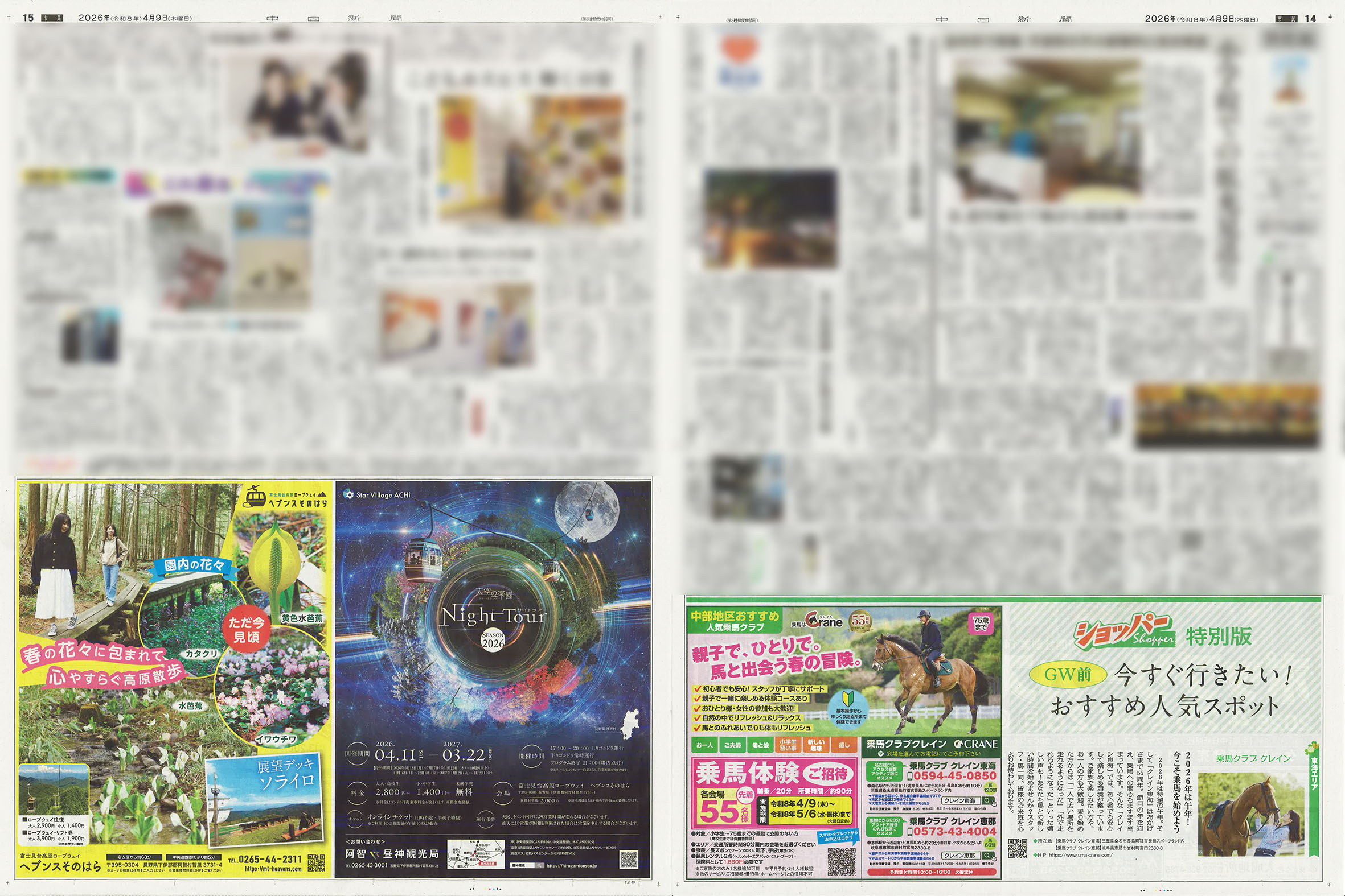 中日新聞市民版・尾張版にショッパー特別版(全7段+全5段)にて「GW前 今すぐ行きたい! おすすめ人気スポット」特集が掲載されました。