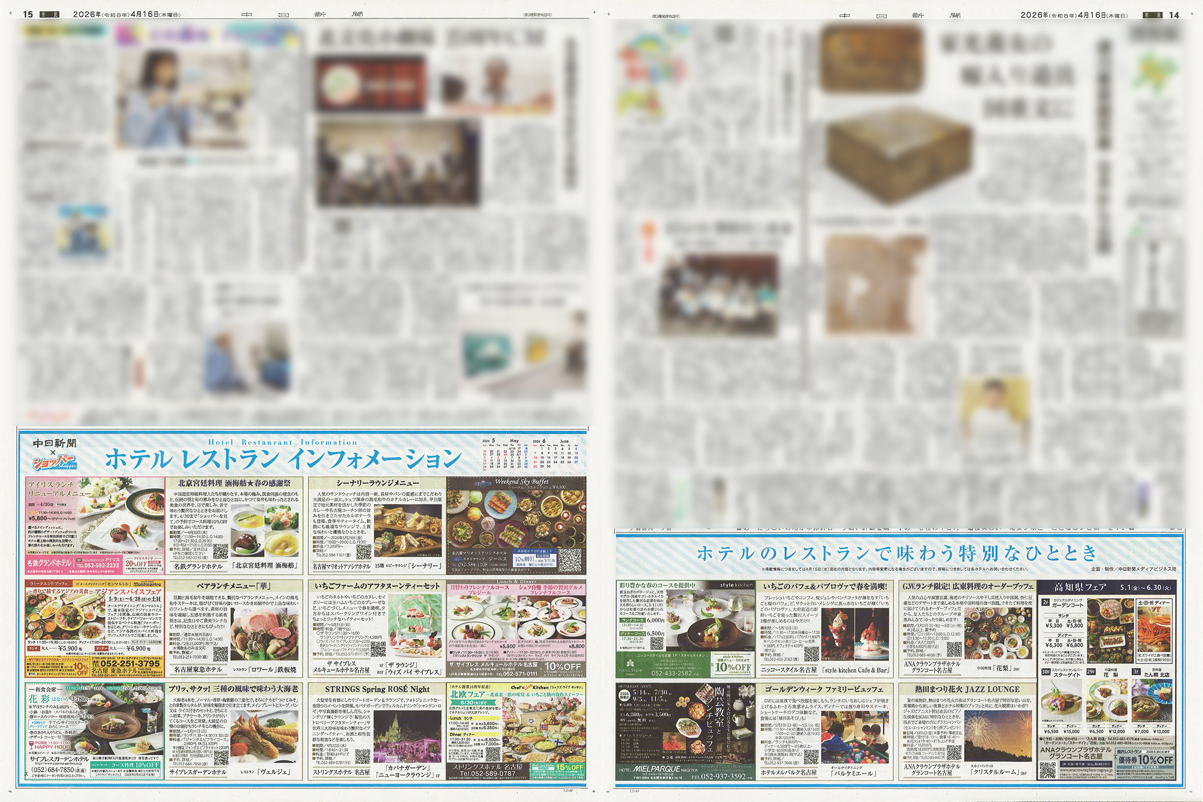 名古屋市内の有名ホテルの春のレストラン情報が掲載。5月のお食事に是非ご利用ください。