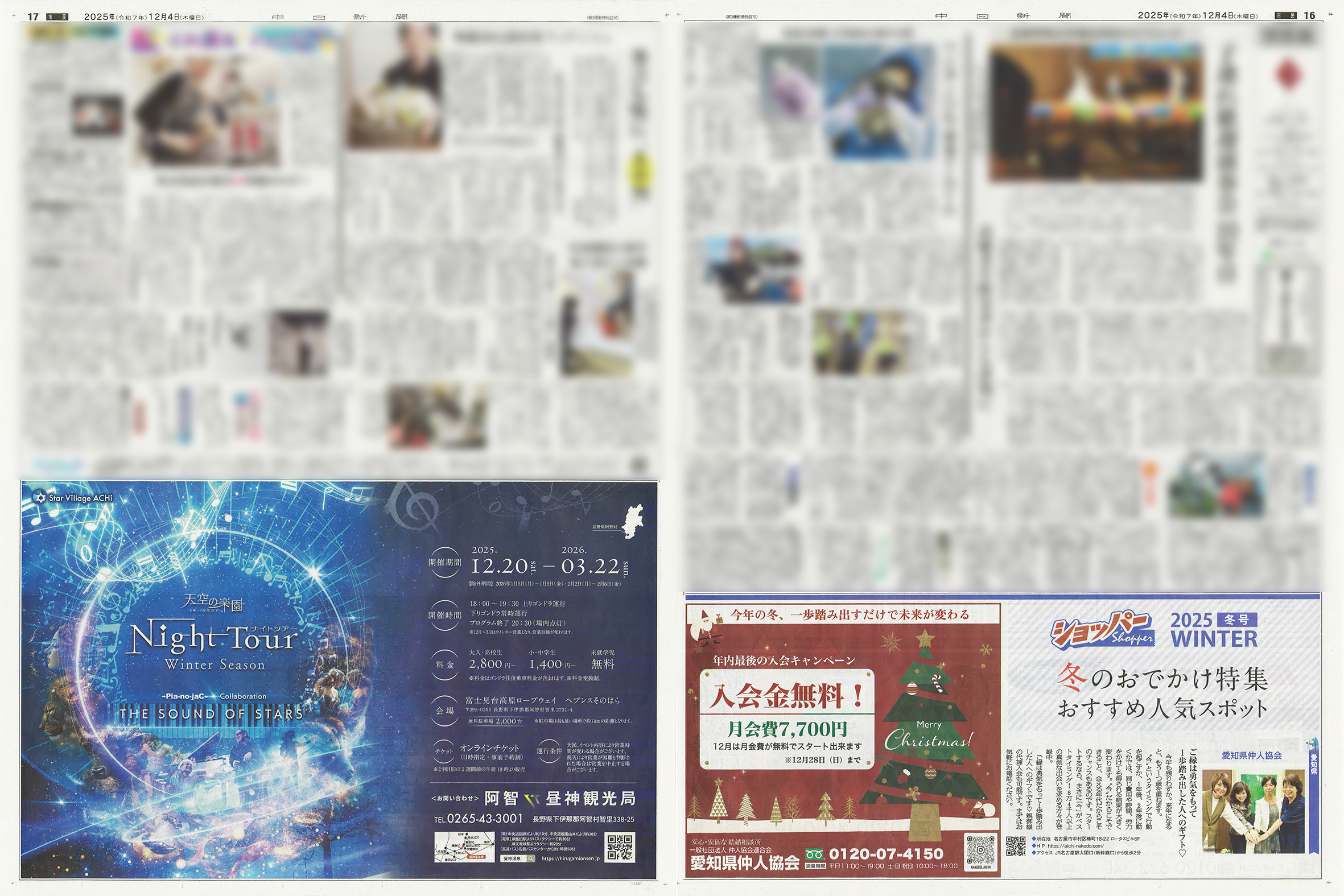 中日新聞市民版・尾張版にショッパー特別版(全15段、全5段+全7段)にて「キラッと光る、煌めきの冬tabi」「冬のおでかけ特集 おすすめ人気スポット」特集が掲載されました。