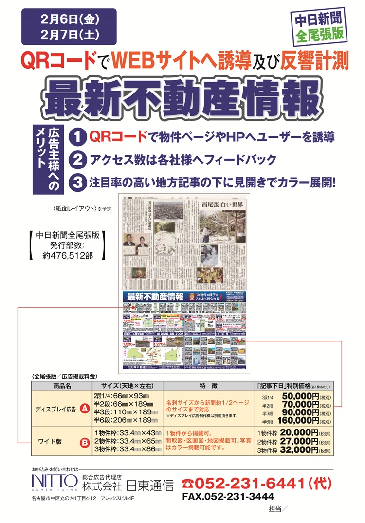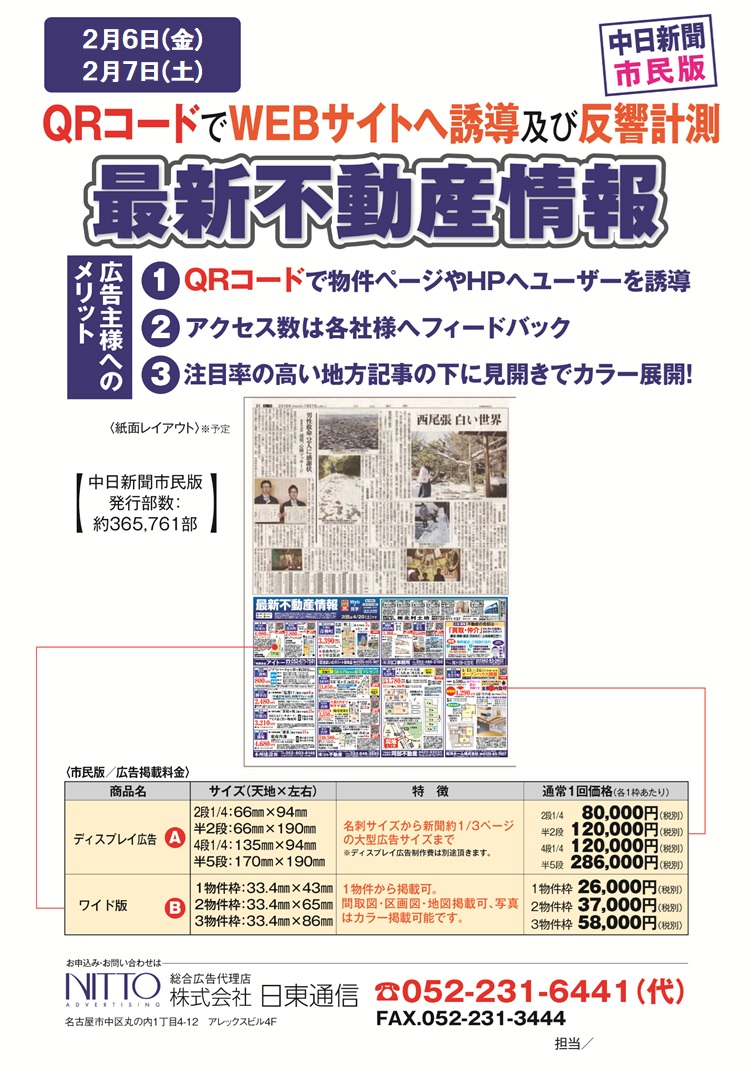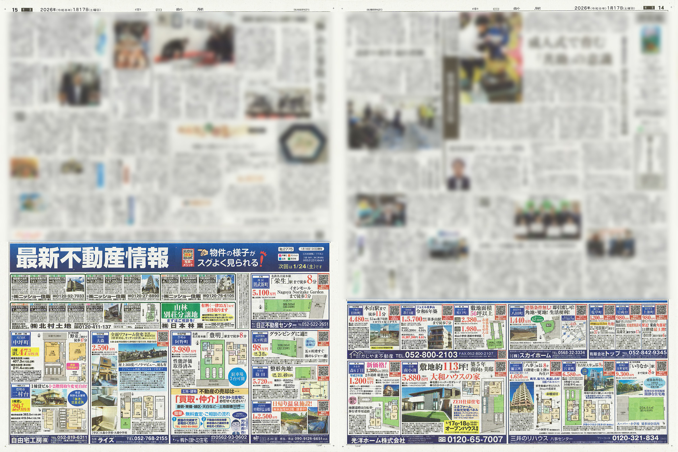 中日新聞市民版に最新不動産情報(全7段+全5段/カラー)、全尾張版に最新不動産情報(全7段+全5段/カラー)の掲載を予定しております。