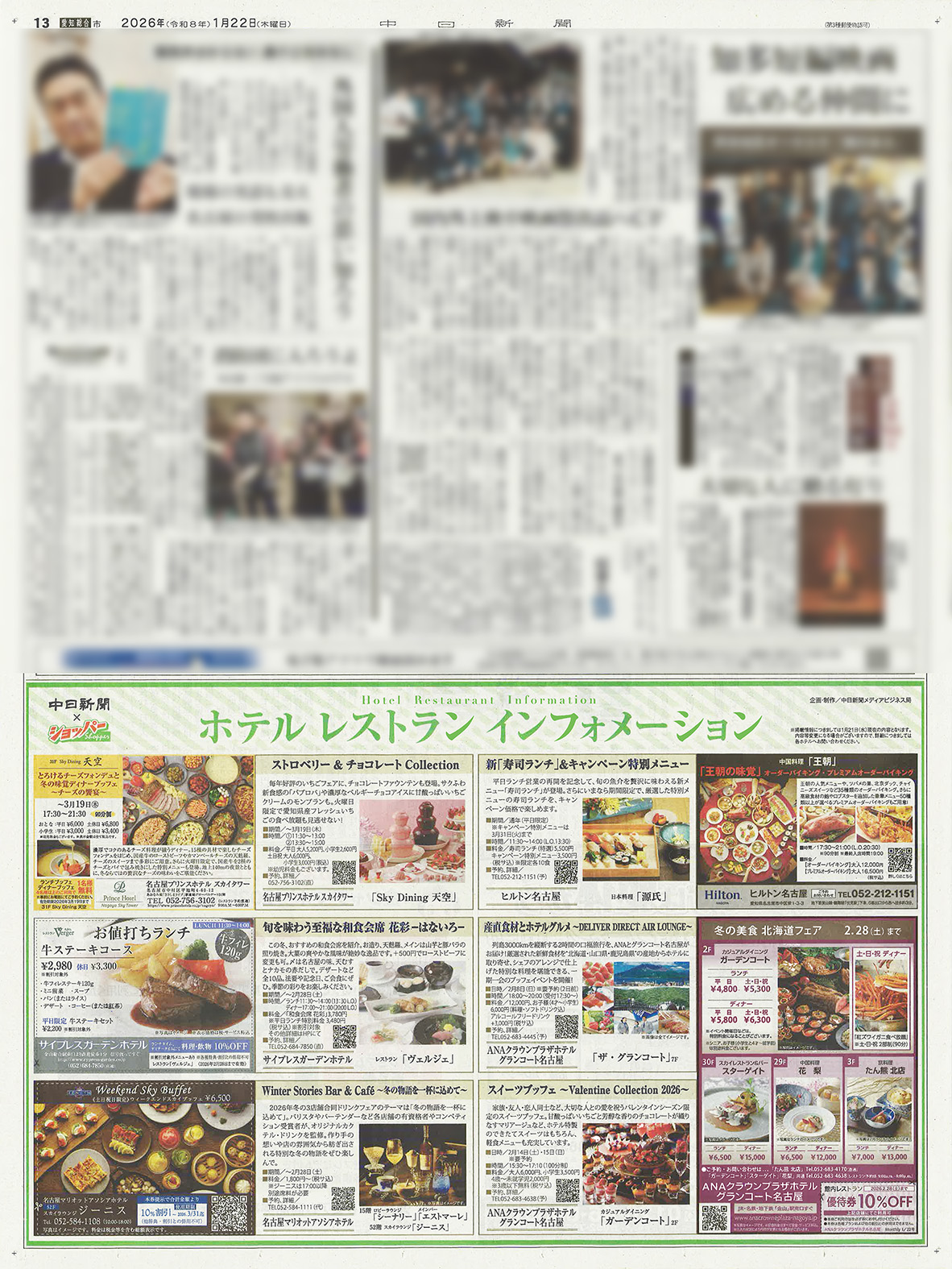 名古屋市内の有名ホテルの冬のレストラン情報が掲載。2月のお食事に是非ご利用ください。