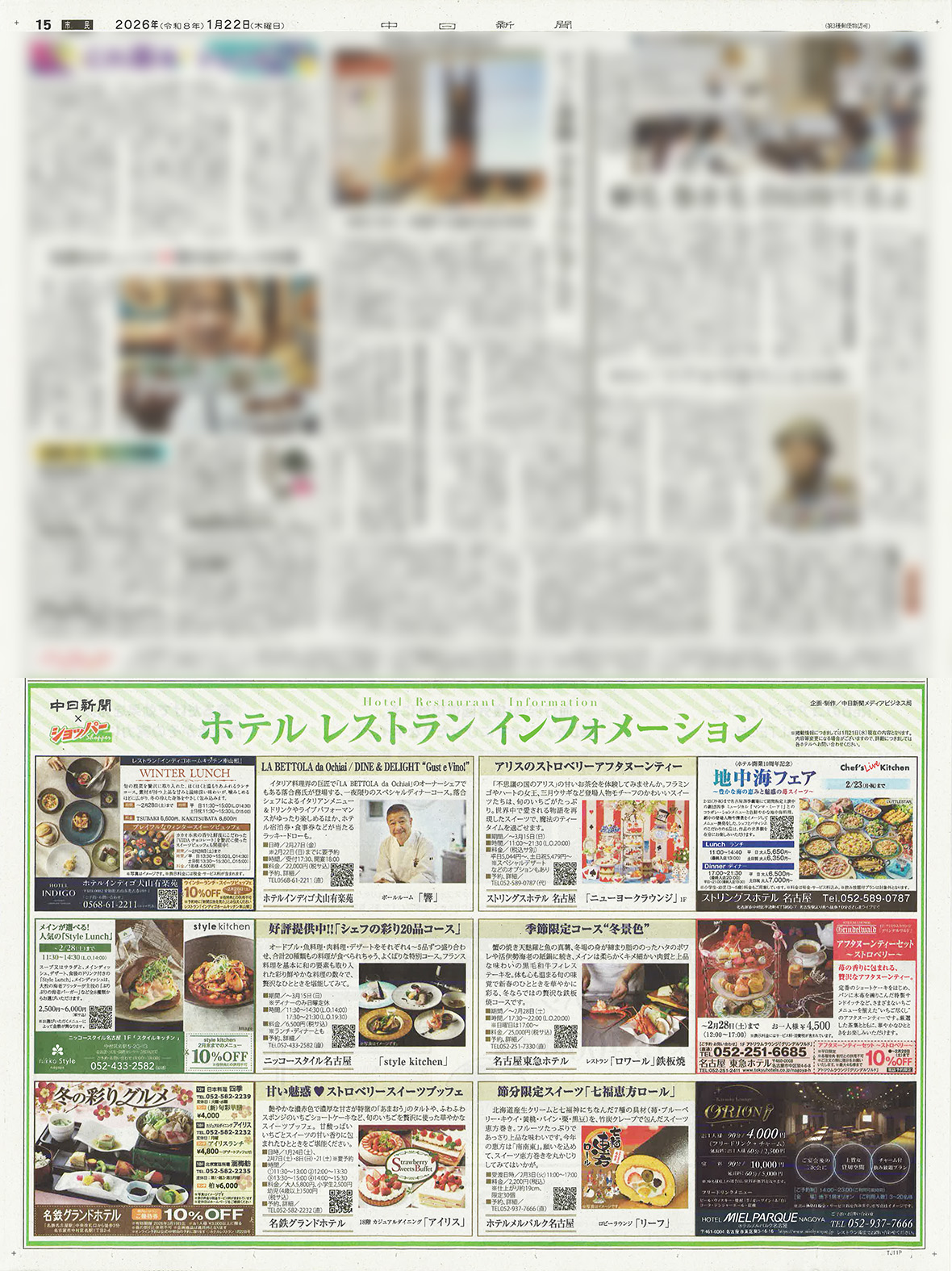 名古屋市内の有名ホテルの冬のレストラン情報が掲載。1月のお食事に是非ご利用ください。