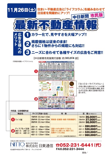 中日新聞市民版に最新不動産情報(全7段+全5段/カラー)、全尾張版に最新不動産情報(全7弾+全5段/カラー)の掲載を予定しております。