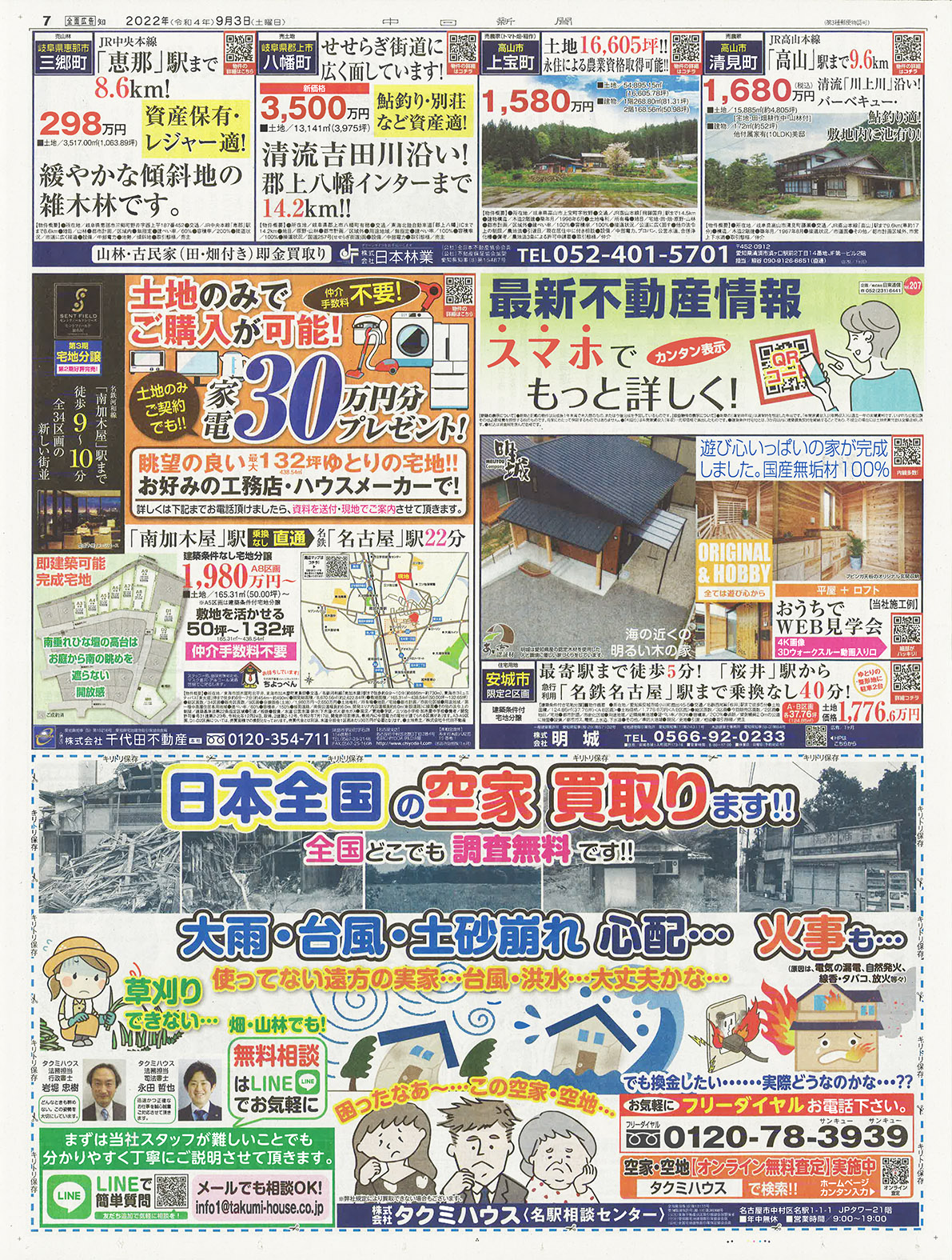 7/8の中日新聞市民版、全尾張版「最新不動産情報」企画がおかげを持ちまして完売致しました。ありがとうございました。