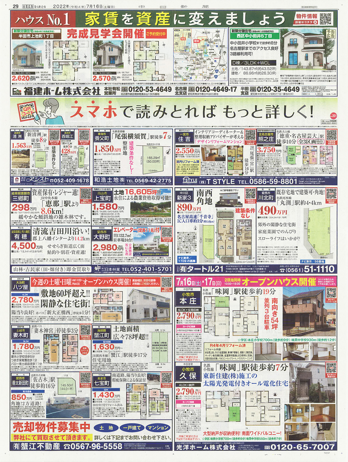 中日聞市民版に最新不動産情報(全15段/カラー)、全尾張版に最新不動産情報(全15段/カラー)が掲載されました。