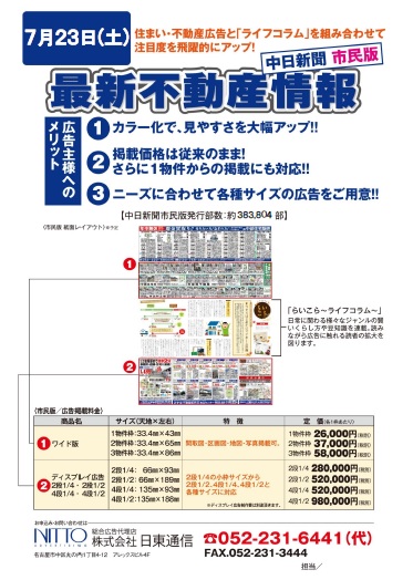 中日新聞市民版に最新不動産情報(全15段/カラー)、全尾張版に最新不動産情報(全15段/カラー)の掲載を予定しております。