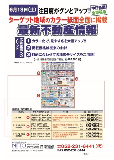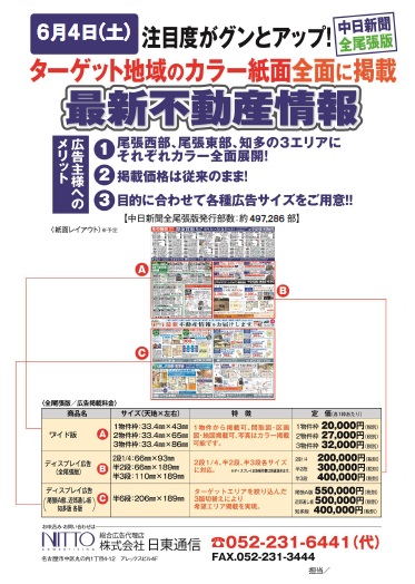 中日新聞市民版に最新不動産情報(全15段/カラー)、全尾張版に最新不動産情報(全15段/カラー)の掲載を予定しております。