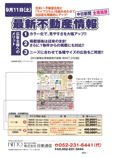 中日新聞市民版に最新不動産情報(全15段/カラー)、全尾張版に最新不動産情報(全15段/カラー)の掲載を予定しております。