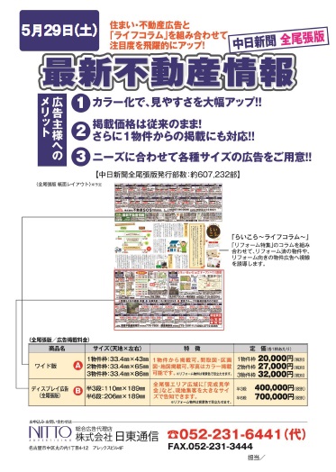 中日新聞市民版に最新不動産情報(全15段/カラー)、全尾張版に最新不動産情報(全15段/カラー)の掲載を予定しております。