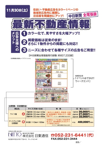 中日新聞市民版に最新不動産情報(全15段/カラー)、全尾張版に最新不動産情報(全15段/カラー)の掲載を予定しております。