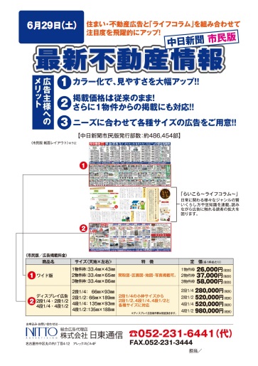 中日新聞市民版に最新不動産情報(全15段/カラー)、(全尾張版に最新不動産情報(全15段/カラー)の掲載を予定しております。