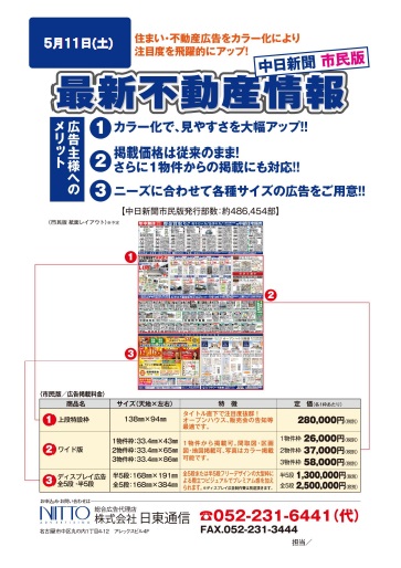 中日新聞市民版に最新不動産情報(全15段/カラー)、全尾張版に最新不動産情報(全15段/カラー)の掲載を予定しております。